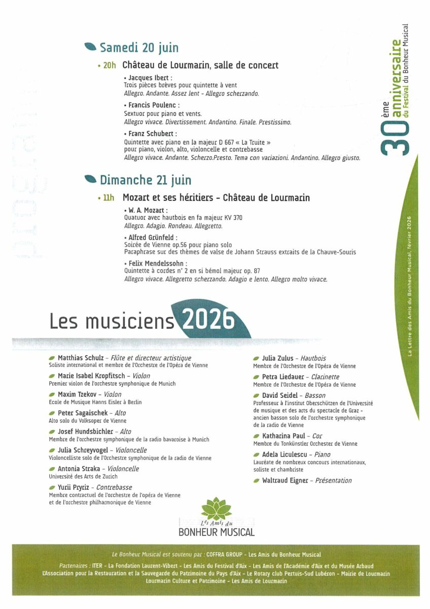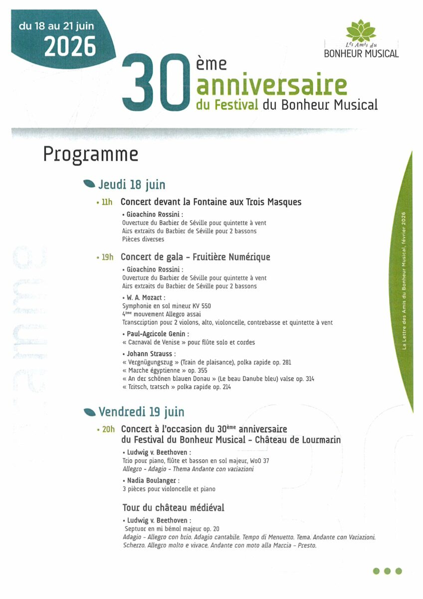 Accueil Evénements Festival Bonheur Musical Concert, Festival, Vie du village Date de début 18 juin 2026 11h00 Date de fin 21 juin 2026 11h00 Pour plus d’informations : /https://bonheurmusical.com/